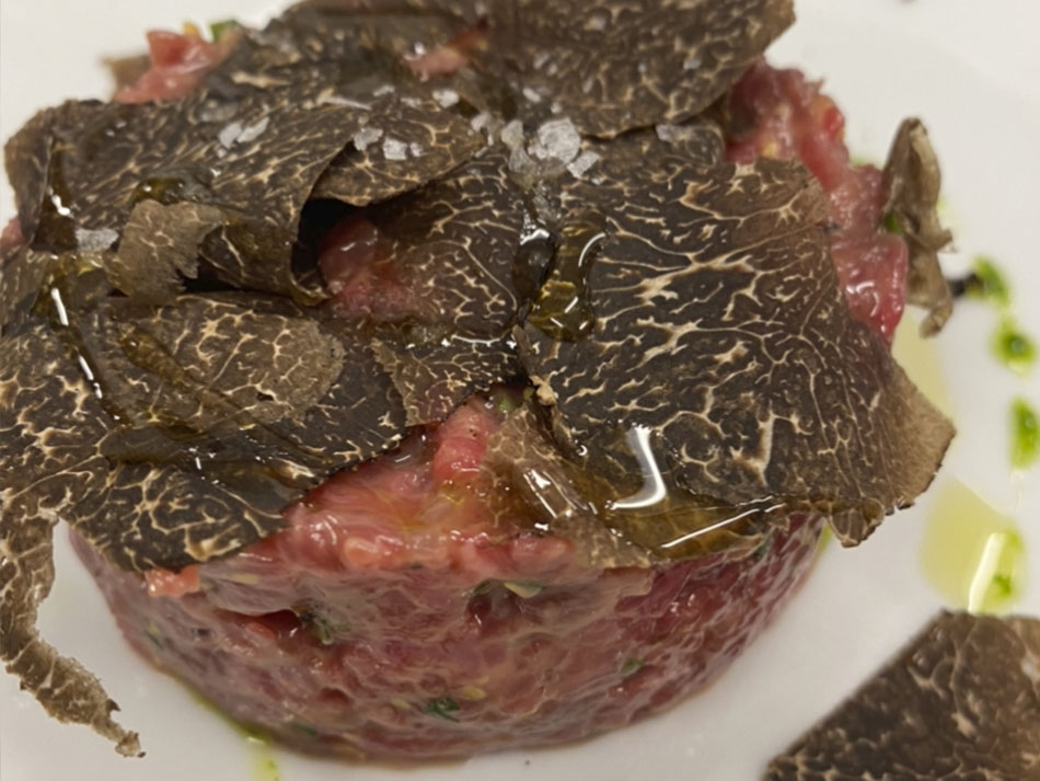 La carne picada a cuchillo con el aliño separado para que se lo pueda acabar en el momento que se lo quiera comer.